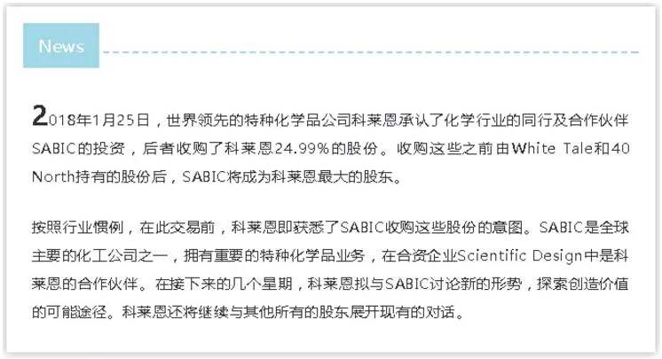 2018年1月SABIC收購科萊恩25%股份