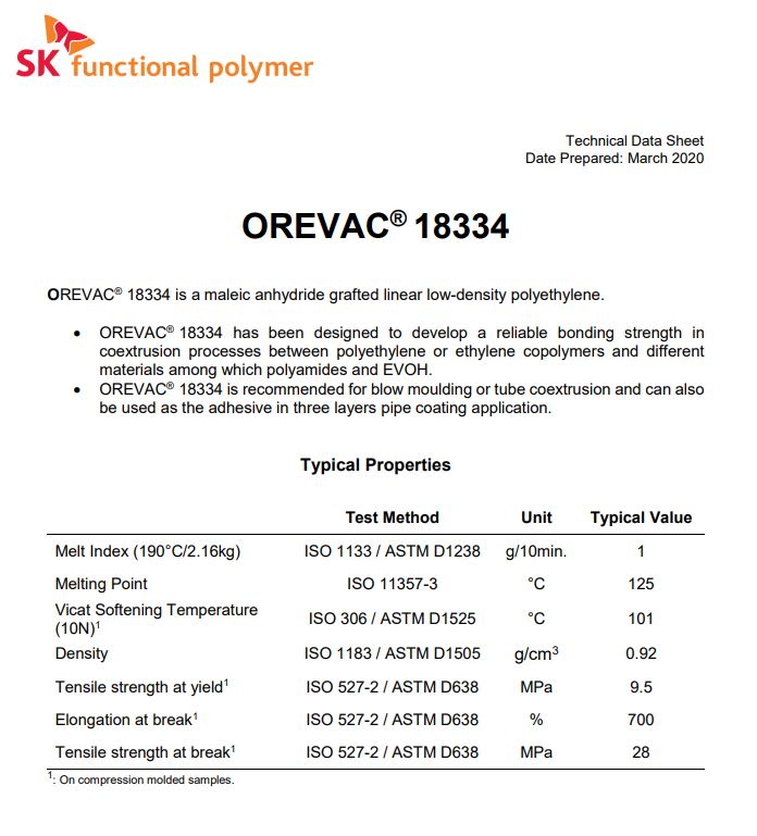 - LLDPE馬來酸酐改性 Orevac 18334 法國阿科瑪 EVOH極性樹脂粘接 物性表, LLDPE馬來酸酐改性 Orevac 18334 法國阿科瑪 EVOH極性樹脂粘接 產品參數, LLDPE馬來酸酐改性 Orevac 18334 法國阿科瑪 EVOH極性樹脂粘接 性能表, LLDPE馬來酸酐改性 Orevac 18334 法國阿科瑪 EVOH極性樹脂粘接 出廠報告, MSDS,, 物質安全資料表, UL黃卡,{ SGS報告, RoHS, 食品級認證, NSF飲用水標準, 產品資料, 產品性能, 出廠報告, 原廠原包, 代理商, 熱變形溫度, 熔指數, 流動系數, 抗沖擊性能、沖擊強度, 低溫韌性、低溫抗沖擊性能, 熔體流動系數、熔體流動速率, 加工工藝、加工參數、加工溫度, 歐盟RoHS 德國FDA 美國FDA 日本FDA