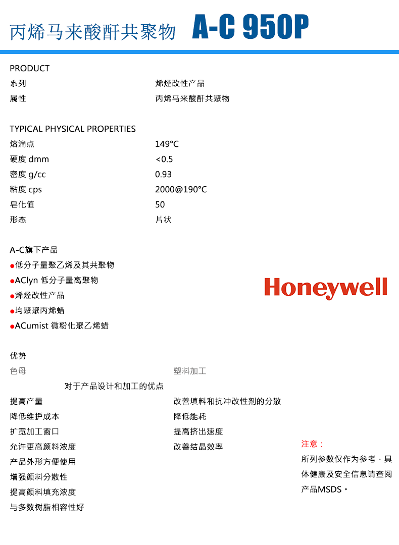 - 霍尼韋爾 honeywell 丙烯馬來酸酐共聚物 A-C 950P 適用熱熔膠電纜塑料改性 物性表, 霍尼韋爾 honeywell 丙烯馬來酸酐共聚物 A-C 950P 適用熱熔膠電纜塑料改性 產品參數,霍尼韋爾 honeywell 丙烯馬來酸酐共聚物 A-C 950P 適用熱熔膠電纜塑料改性 性能表,霍尼韋爾 honeywell 丙烯馬來酸酐共聚物 A-C 950P 適用熱熔膠電纜塑料改性 出廠報告, MSDS,, 物質安全資料表, UL黃卡,{ SGS報告, RoHS, 食品級認證, NSF飲用水標準, 產品資料, 產品性能, 出廠報告, 原廠原包, 代理商, 熱變形溫度, 熔指數, 流動系數, 抗沖擊性能、沖擊強度, 低溫韌性、低溫抗沖擊性能, 熔體流動系數、熔體流動速率, 加工工藝、加工參數、加工溫度, 歐盟RoHS 德國FDA 美國FDA 日本FDA